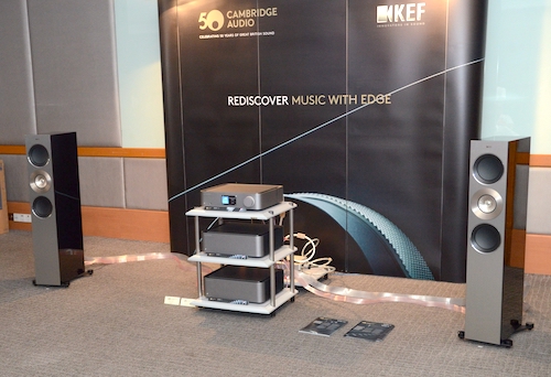 The same exhibitor had another interesting system, the Cambridge Audio Edge NQ network player/preamp paired with an Edge W power amplifier, the British electronics manufacturer’s 50th anniversary range of electronics, driving KEF Reference 3 speakers.